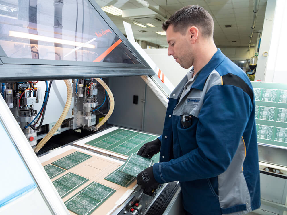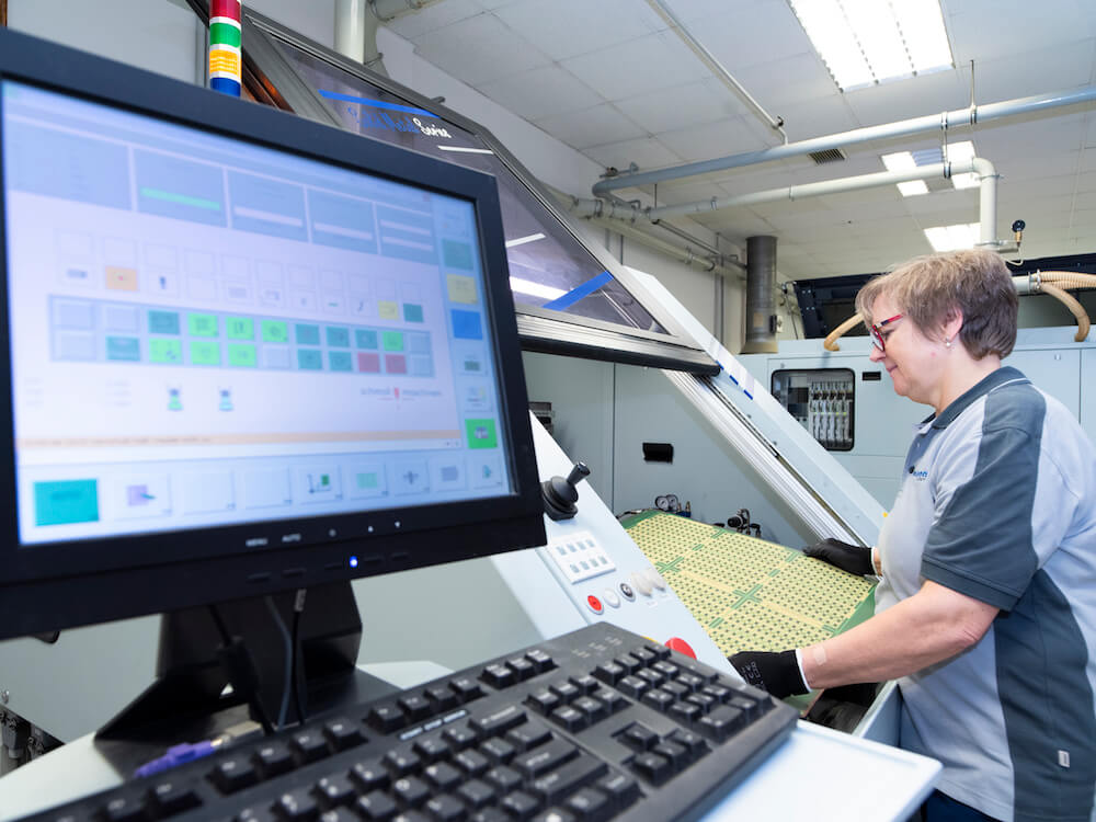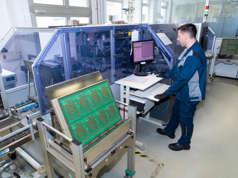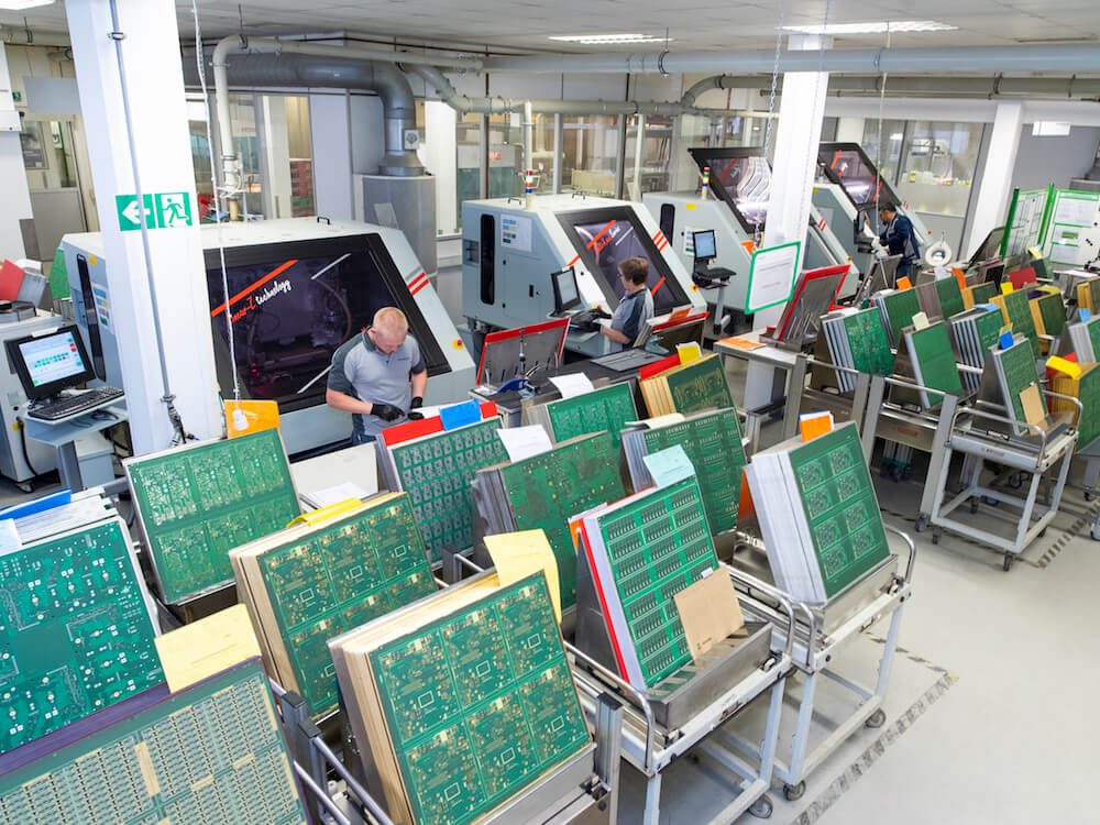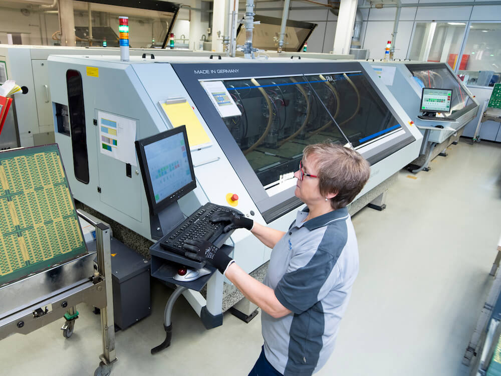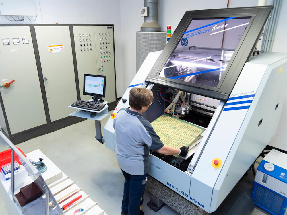 In der Fräserei werden die Leiterplatten ins gewünschte Endformat gebracht, entweder als Einzelnutzen oder als Bestückungsnutzen. Möglich sind hier fast alle Konturen.
