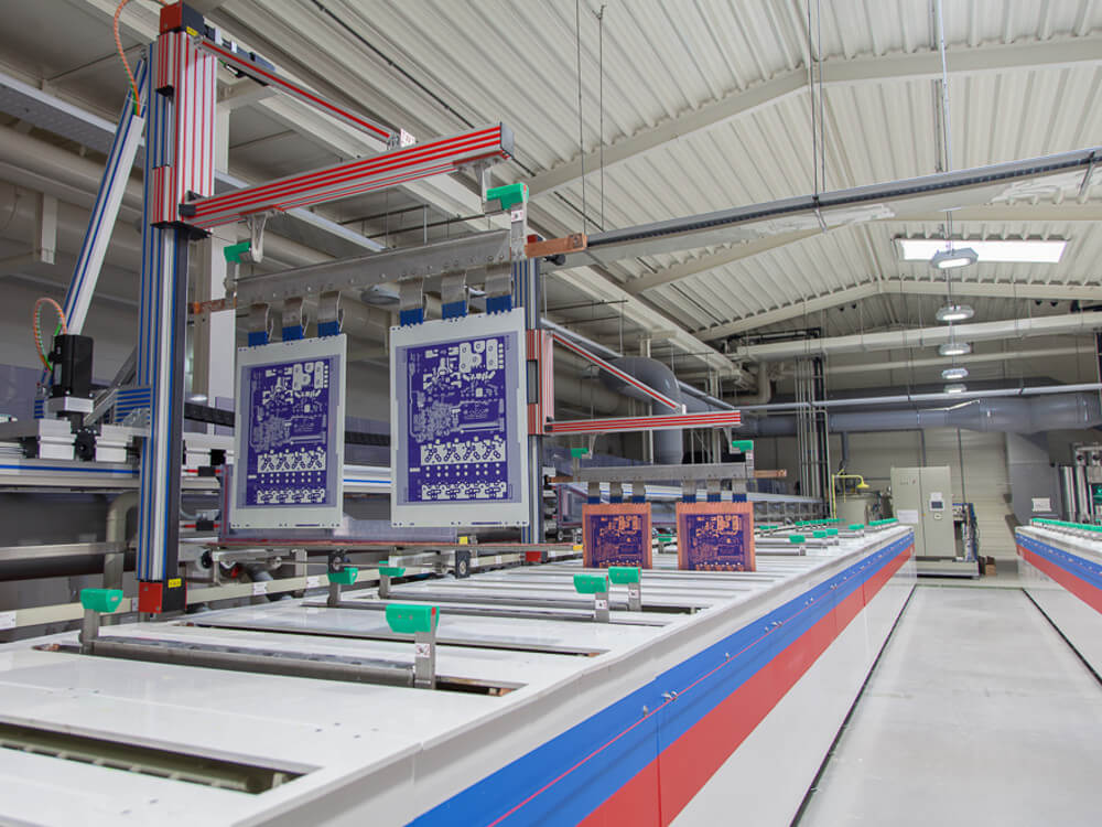 Dieser Prozess ist computergesteuert und basiert auf der Elektrolyse. Die Leiterplatten durchlaufen verschiedene Bäder, in denen mittels Stromfluß von der Anode Kupfer auf die Kathode, in diesem Fall die Leiterplatte, übertragen werden.