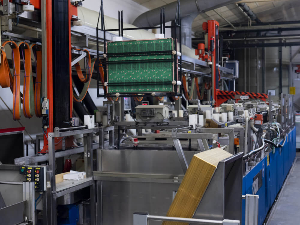 In der Galvanik wird das geforderte Endkupfer aufgebracht. Je nachdem wie hoch das Kupfer aufgebaut werden soll, ist die Durchlaufzeit entsprechend länger. Für eine gleichmäßige Kupferverteilung auf der Oberfläche ist das Leiterbild maßgeblich entscheidend. So ist es möglich, dass ein zusätzliches Kupferraster aufgebracht werden muss.